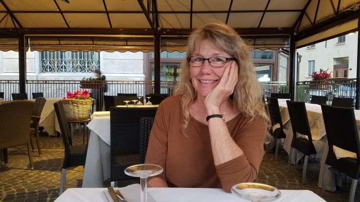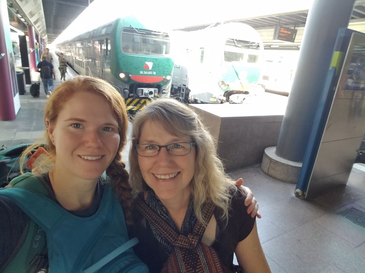 Thank goodness our Rick Steves tour only allowed us each a carry-on and no checked luggage. I have an Osprey backpack designed for traveling as well as a little one for a day pack. Even though my bag only weighed around 20#, it was a lot to be lugging around from plane to plane and train to metro. Mom has a small borrowed backpack and her extra-rolly carry-on suitcase which kept trying to escape every time the train/metro changed speed quickly. There wasn’t any room for us to sit so we were hanging on to grab bars for our short journey to Porto Genova. With my big bag on my back and my little one on my front, I felt quite at the mercy of gravity so I hung on tight!