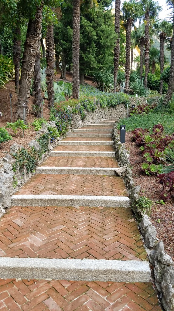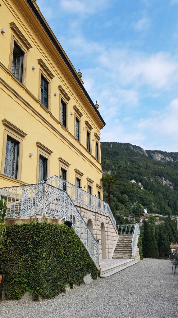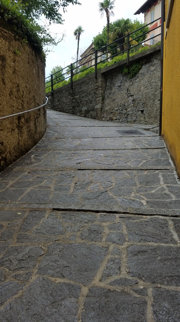 We arrived at Hotel Royal Victoria (🤯) before our room was ready, so we took our time and wandered around our adorable part of Varenna. There’s really only the one road big enough for cars that passes through town. All the rest are 6-8′ wide rock pathways and stairs that couldn’t be more idyllic. Almost all the buildings here are soft shades of pink, yellow, blue, and cream. It’s beautiful. However, my calves were complaining about the stairs by the time we headed back to the hotel to check into our room. They’ve got an interesting way of building stairs in pathways here… the steps aren’t level. The whole step itself is inclined, maybe halfway between level and the natural incline. I don’t mind it so much going down, but going up it’s much more work for the calves vs flat steps being more for the thighs.