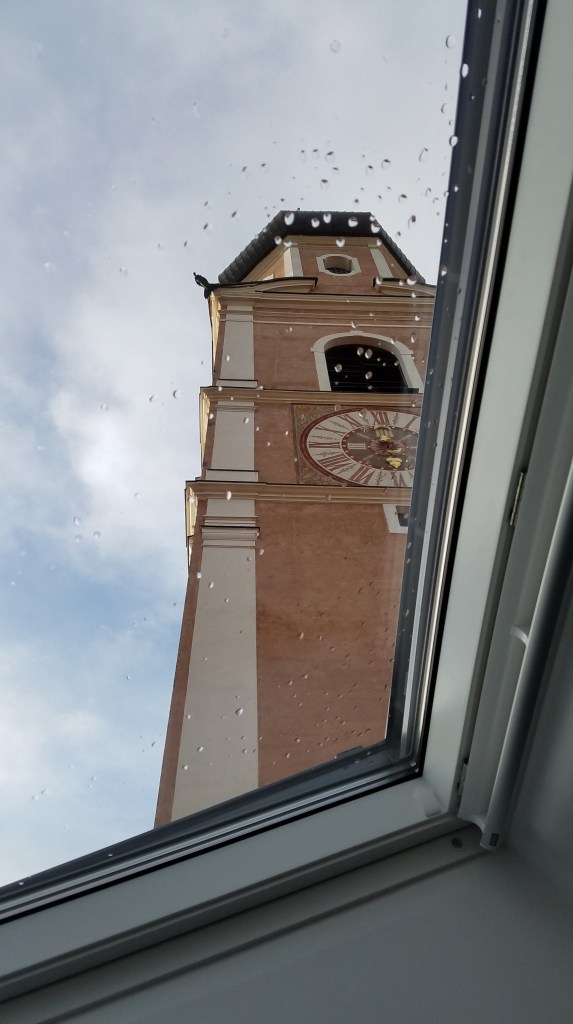 It was dark and late by the time we finished our meal so the town was very quiet as we made our way back to the hotel. Mom and I got quite the room… We’re not supposed to talk about our rooms to prevent room-envy but Mom and I actually got a suite of sorts; two bedrooms with a bathroom in-between. We were on the top floor of the building so we also had these great skylights which gave me a nice perspective of the bell tower.