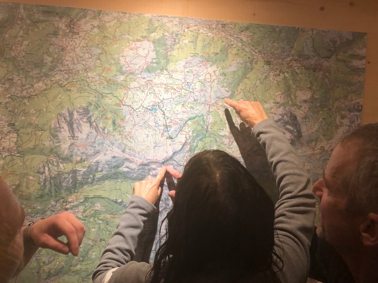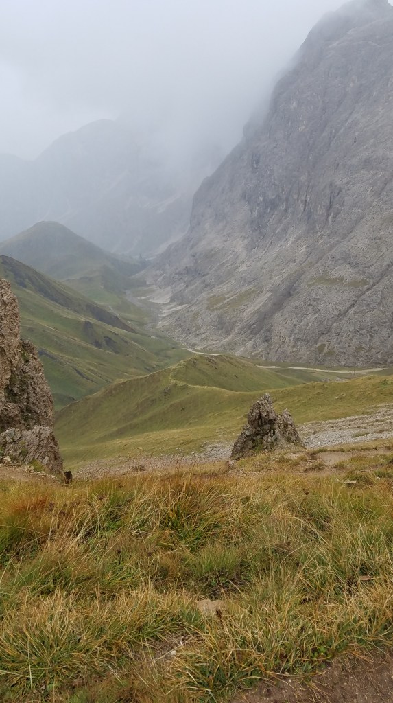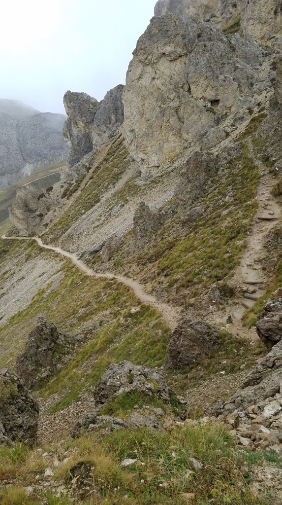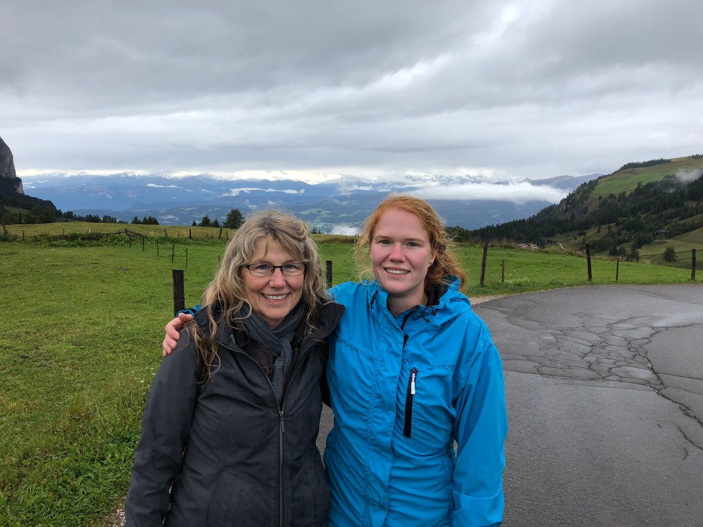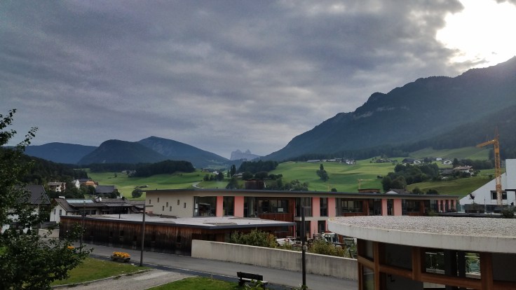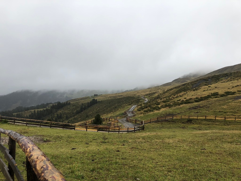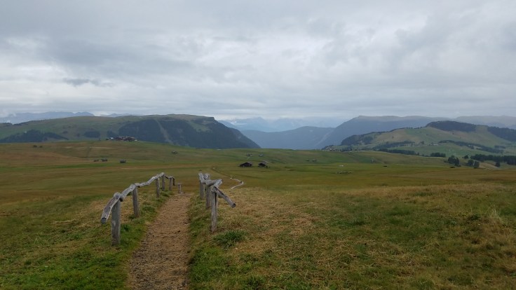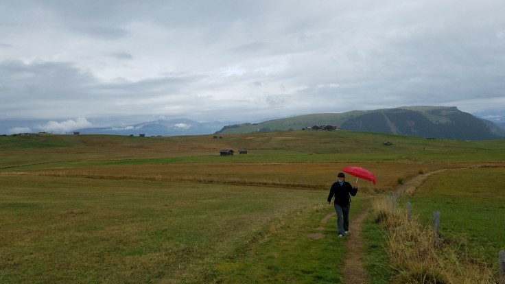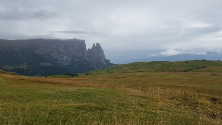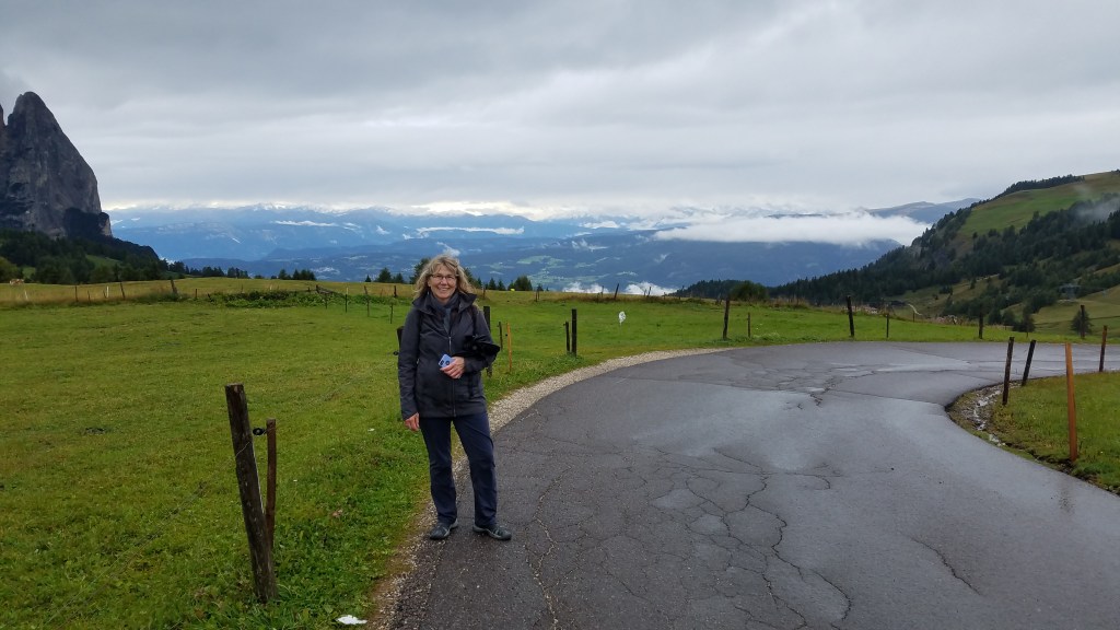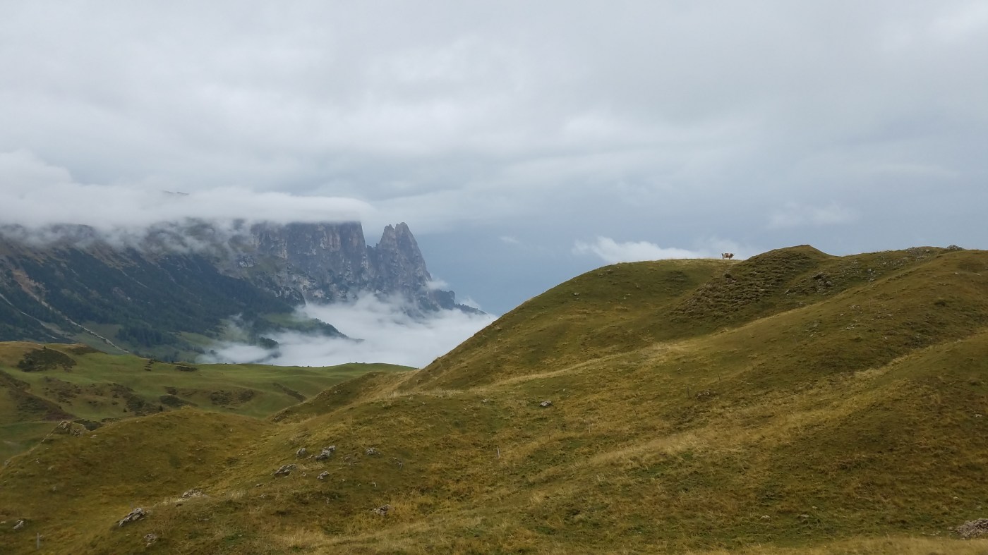 We woke up to a partly cloudy sky, so I still had high hopes that they’d miraculously clear off for us. We all had breakfast at the hotel (Hotel Cavallino d’oro) and then took a bus up to Compatche. From there, a gondola took us up to the Seiser Alm and another short chair lift got us up to the Panorama trail. It was a very beautiful ride up and we could immediately see a bit of the majestic Dolomites despite the clouds. Sarah and much of the group were going to walk the Panorama “hike” (wheelchair accessible so not quite a hike in my book) but a few of us wanted something more challenging and longer so we peeled off and found our own route.