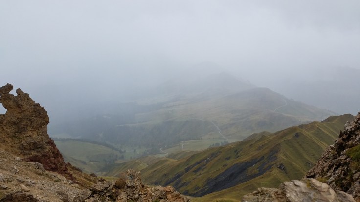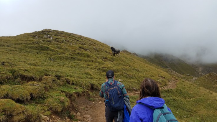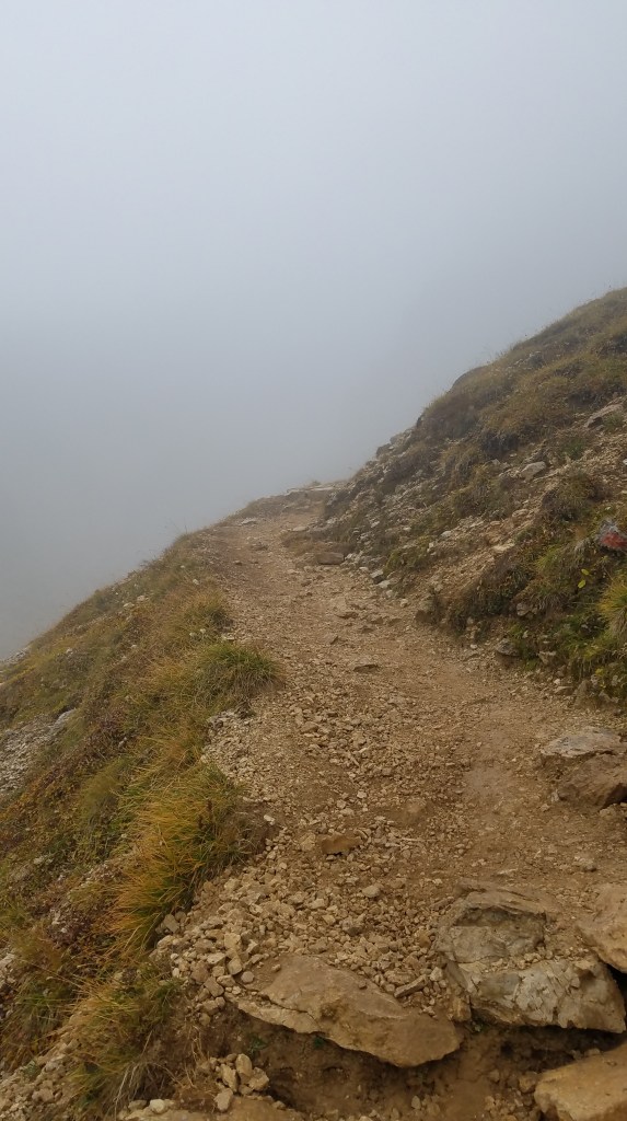 Eventually we started climbing fairly steeply, rocky switchbacks and stairs made using forked branches. As we ascended, the clouds descended and the fields we started in disappeared from view.