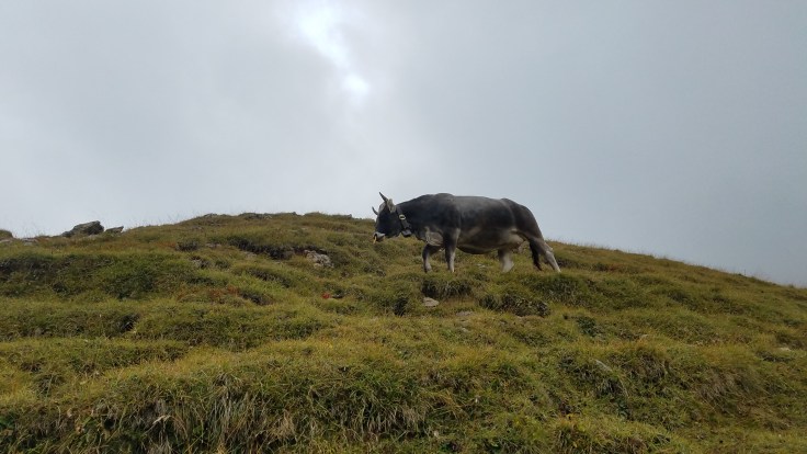 We used the map given to us at the hotel and found a hike that headed up to a decently high saddle, around a small peak, and back down the hillside to a hut where we could get snacks, drinks, etc. Happy with our plan, we set off on our trail #2, through the lush green cow pastures towards the jagged looming mountains. This area of Italy is much more Austrian-feeling than Italian and German is more the more prevalent language. It was a very nice change to see such healthy cattle with tons of room to roam. All of the livestock we saw also wore large bells so the pleasant sounds of cowbells rang around in the fields and valleys. It was just starting to sprinkle on us as we headed up the hill.