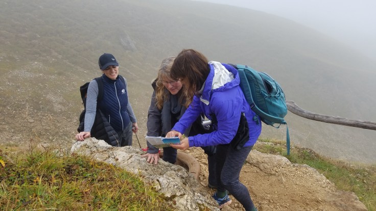 It was starting to rain decently on us as we reached the saddle. We kept checking the map and as we climbed I think Mom and Mariellyn were getting a little concerned about where we were headed. Norm just recently passed his whitewater rafting company to his son, so he’s definitely an adventure type and was great about checking in with everyone if we were comfortable. Mom’s knee was starting to bug her 😕
