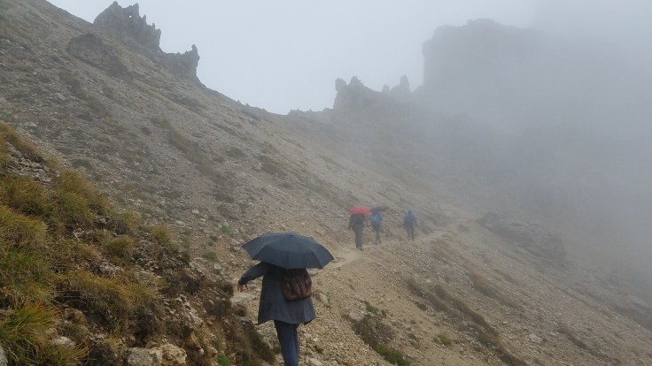 The way down the backside of the mountain was much easier, parts of it were actually the road that could be taken to drive up to the hut. Despite the non-stop rain, the whole ordeal was beautiful. No one else in our group got to see the side of the Dolomites that we did and it was quite a bonding experience. I was a little bummed we couldn’t see more of the Alps from the top, but it did clear just enough on our way down to see that the highest peaks had gotten some fresh snow. We also passed this really creative picnic table.
