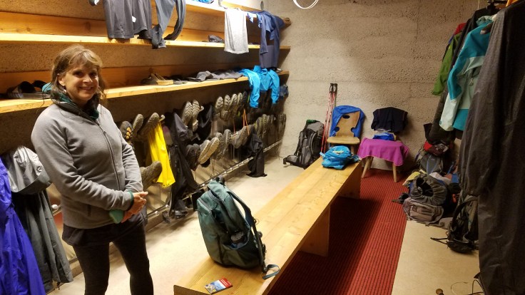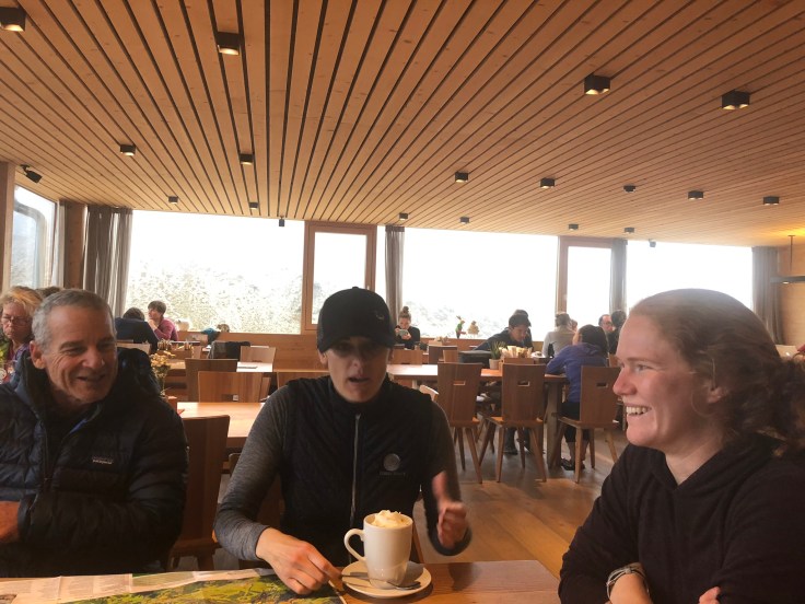 Luckily, we passed another couple hikers (we saw very few other people on our trail) and they said there was a hut just a little ways further to the right (we had planned to head to the left but…). Given our state, we abandoned all maps and set off at a quicker pace to get to this hut before we froze. My fingers were numb at this point so I didn’t take a ton of pictures for most of the rest of the hike. Thankfully the hut wasn’t terribly far and we hurried in out of the weather. It wasn’t terribly warm in the hut, but we were just happy to have shelter and take off our layers for a brief rest. The huts are larger than you’d imagine, with a bar and lots of seating. We all got hot chocolates with whipped cream and oh man that was what we needed. While we were sitting there, we studied maps to figure out the best way back down and Tara checked the weather… 35°F outside. No wonder we were freezing. The hut had baskets of slippers so everyone could take off their hiking boots which also kept the place much cleaner.