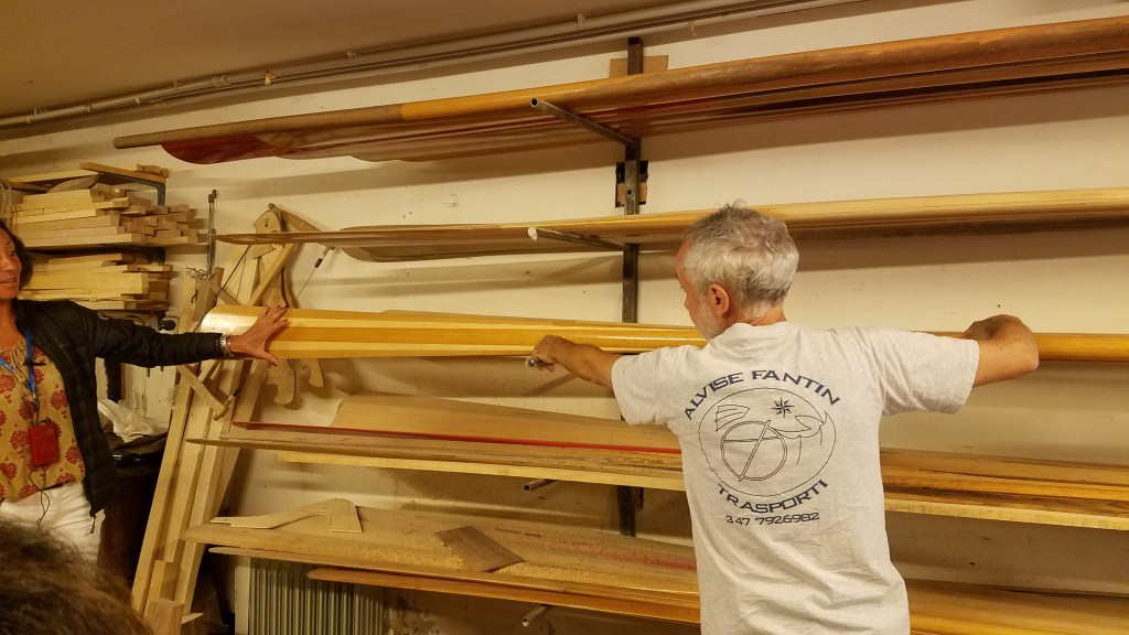 Midway though our walk, we got to visit this artisan’s workshop where he makes the very unique parts of the gondolas. He’s one of only a few people left in the city that make fucolas – sort of the equivalent of the gear shaft. The fucola is unique to each gondolier and gondola because it’s based on his (mostly) height and trimmed to fit the gondola tightly. It’s made from pear, cherry, or walnut wood and takes him about 50 hours to make one. He also makes and repairs oars. I didn’t catch the type of wood traditionally used, but the way they are made has changed a bit. They do much more lamination now instead of just using a couple pieces. It sounds weird, but the oars that he make actually have the slightest bit of an s-curve to them to made them more effective. Almost all of the gondoliers are male, but apparently there is one female gondolier who actually races. She’s the daughter of another well known competitive gondolier and learned the skill from him.