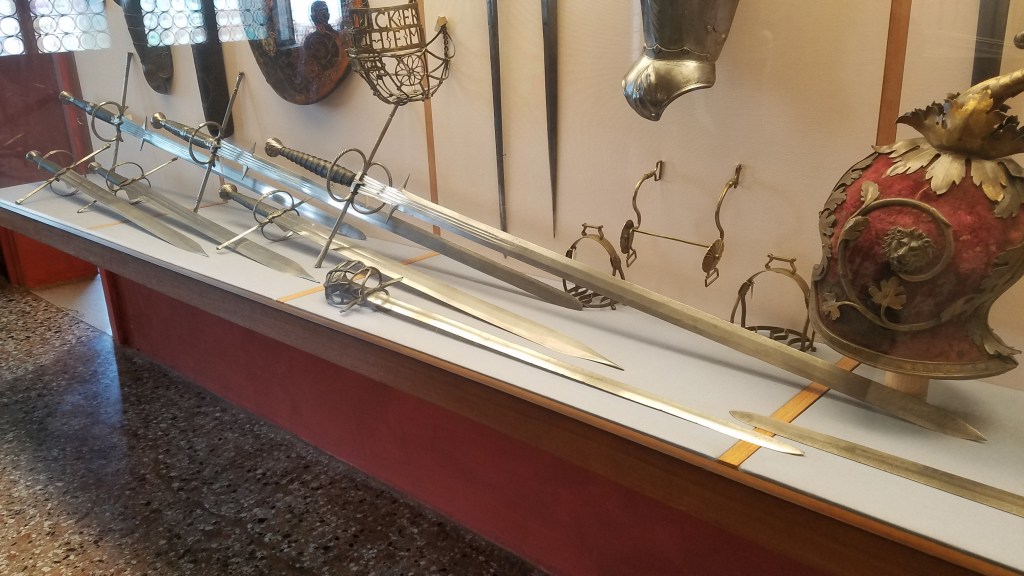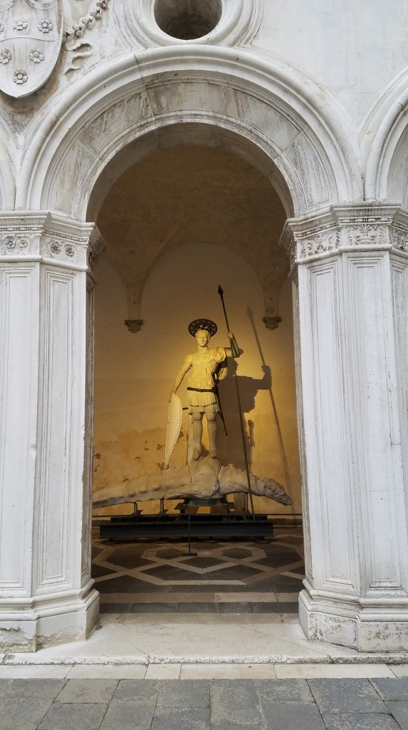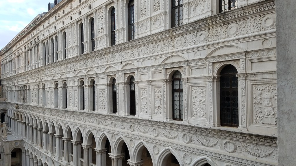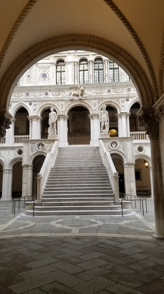 Later this afternoon we drug ourselves out of the room and went to see the Doge’s Palazzo. The Doge family ruled Venice for quite a long time. They were rich and powerful and flaunted it every way they could. The palace was huge with probably a hundred plus arches. A very grand stairway led up to the HUGE rooms where the Doge would meet his subjects. He liked to make them climb up to his level and made them walk through an armory display just to really get the point across who they were dealing with.