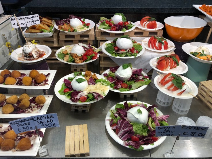 We were in line eyeing some pizza when a guy walked by with a beautiful olive/tomato/lettuce plate with a huge mound of mozzarella in the middle. It looked so delicious we asked where he got it and followed suit. Such a simple meal but so fresh and flavorful.