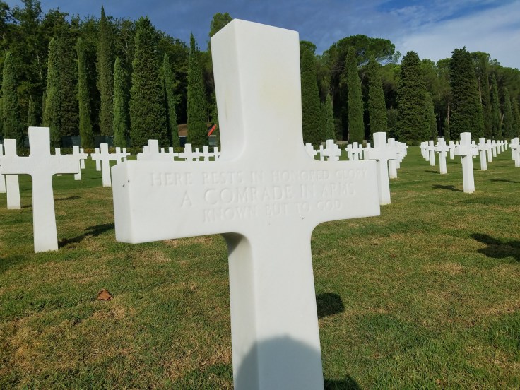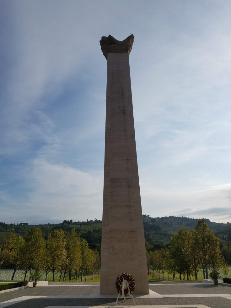 The first stop was just a half hour outside Florence: the Florence American Cemetery. I can’t remember the exact number of service members buried here, but it doesn’t really matter because a high percentage of those who died in WWII were returned home to be laid to rest. This cemetery was for all service men and women who were killed during the war, from Rome north. Most people know nothing about this cemetery and Angel, our guide, really stressed that that was something that needed to change. At the top of the hill, up from the cemetery, is the Wall of the Missing. Hundreds of names are engraved on this wall, a majority of whom were on bombers, and their bodies not yet found. However, slowly but surely, remains are still being discovered. With technological advances, previously unidentified remains are also being identified and families finally getting closure after all these years. When I came to Europe in 7th grade, we went to the American Cemetery in Normandy and the thing that struck me most were all the un-named headstones. I can’t imagine being a family member and never really knowing what happened to a loved one. We’ve been having a very special experience on this tour and this stop was a great reminder that without all of those men and women who fought, it would be a very different world than it is today.