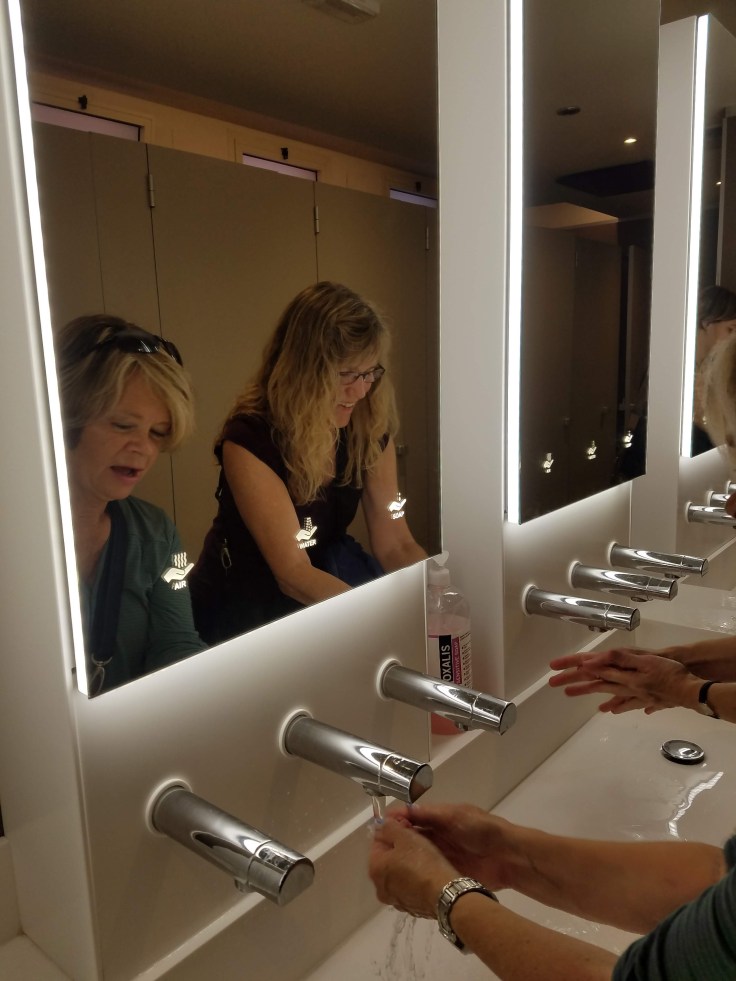 First stop: the toilet. It’s fascinating how many different configurations of water/soap/hand dryers we’ve seen so far. See the tiny lit up symbols on the mirror? I think my favorite so far is the water control pedal on the floor though.