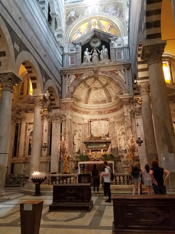 Tara and I split off from Mom at this point because we had luckily gotten a ticket to climb the leaning tower, so we had a timetable to stick to. We went in the cathedral next. The arches and striped marble columns… It’s all amazing. The gold leaf mosaics that cover the ceiling. Paintings and frescoes that line the walls. Plus the beautiful stained glass windows. It’s all so over the top, but such a collection of art. The lamp that Galileo observed swinging which helped him understand the movement of a pendulum was also in this church.
