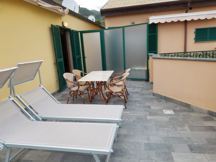 We left Pisa mid-afternoon and drove to Levanto, where we caught a train to Monterosso. The terrain along this part of the coast is very hilly and the road down to Levanto had a few very narrow blind corners. Sauro (our bus driver) slowed way down and laid on the horn before he cautiously went around the corner because we definitely took up the whole road. Everyone got very excited when we caught our first glimpse of the Mediterranean. This region of Italy has its own special olive oil and the terraced hillsides were covered with olive trees. Sarah pointed out that they were getting ready to harvest some of them because they had these orange nets bundled up under the trees.