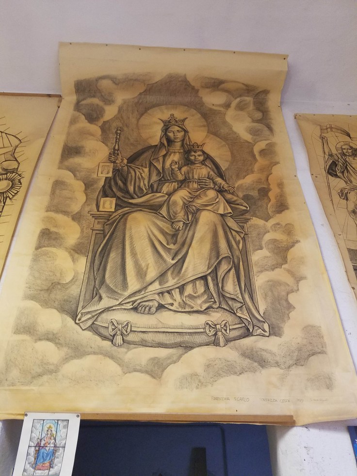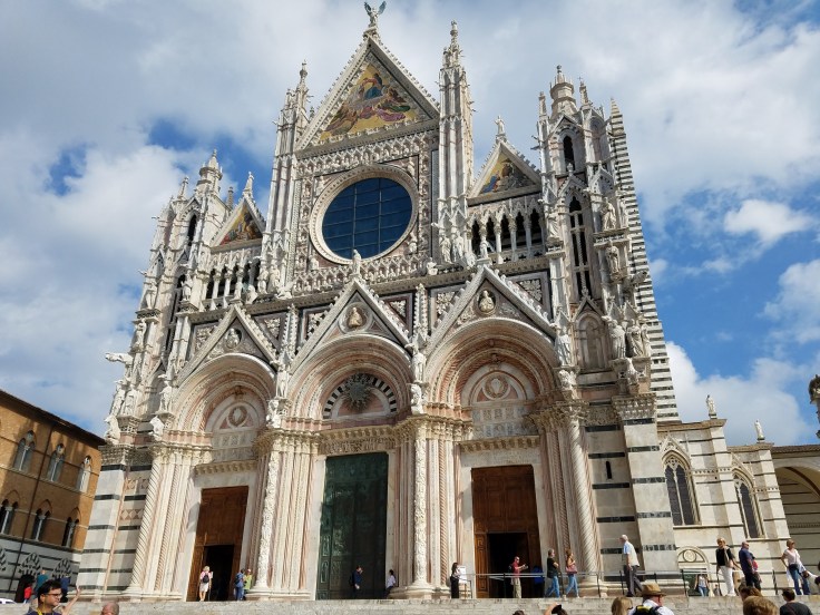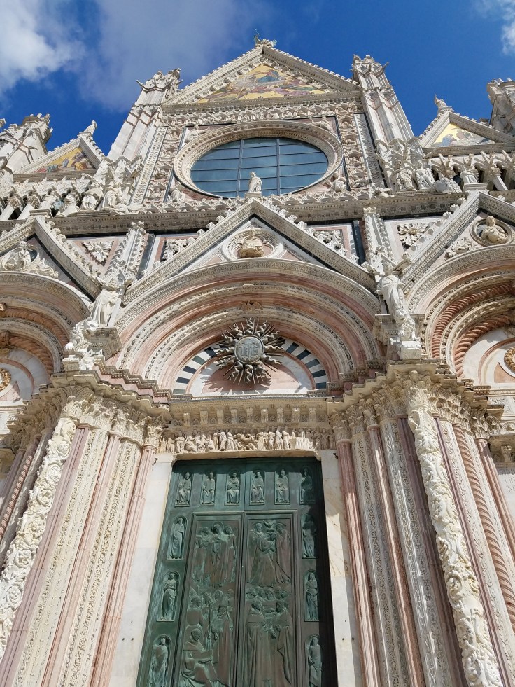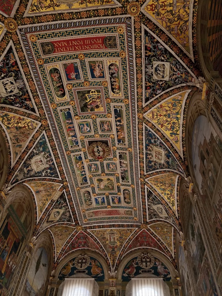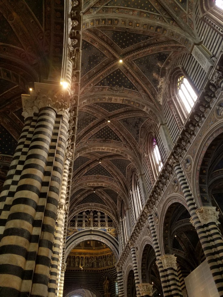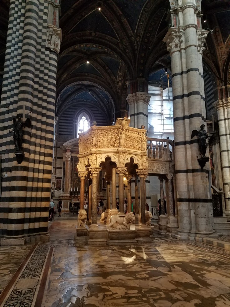 Then we gathered up again and went to the duomo for a local guided tour. We’ve seen a lot of duomos by now but this one definitely stands out because it’s so stripy. The interior is heavily decorated of course, from detailed marble mosaics on the floor to intricate paintings on the ceiling. Our guide told us that until fairly recently, much of the cathedral floor was covered with carpets to keep it protected. There are still small areas that have carpet taped on them, but the majority can be viewed.