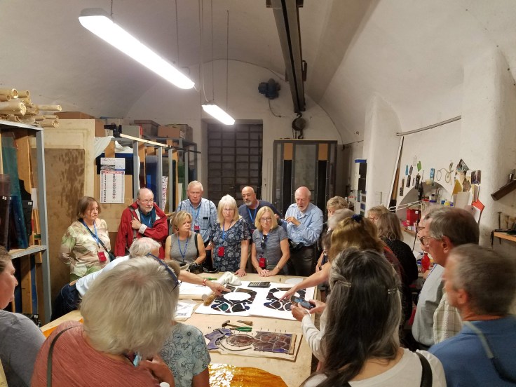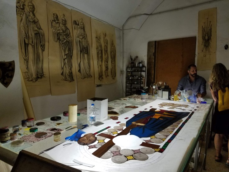 This morning we met up at 9 and went to visit a workshop where stained glass windows were made. Two brothers do most of the work with the glass and hire painters to do the details. It was very impressive to see the images of the finished works and then to see the steps, one by one. His English was very good and he was quite funny. The painter we got to see at work was quite a looker… š
