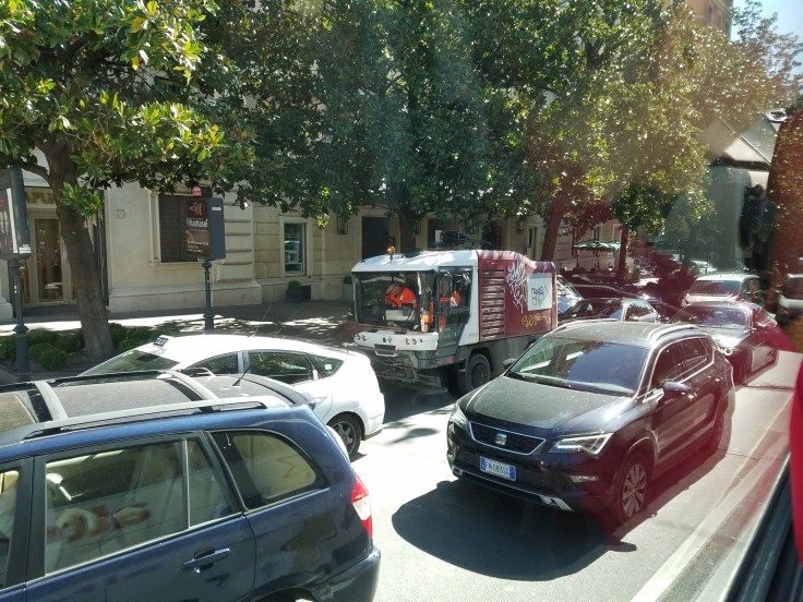 First glimpses of Rome. The traffic very quickly became gridlocked so we got an eye full of the motorbikes weaving amongst the cars, the multiple (unmarked) lanes of the roundabout converging to get through one archway, and the very creative street parking. Apparently sometimes when people double park, they’ll just leave a note on their car saying where they can be found.