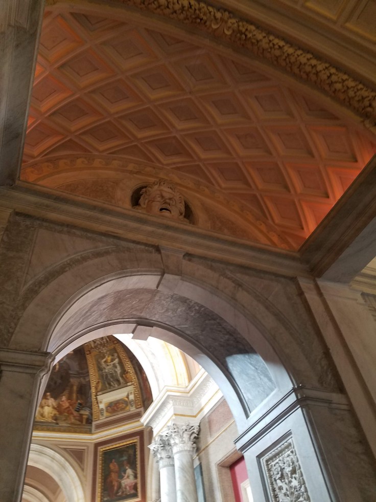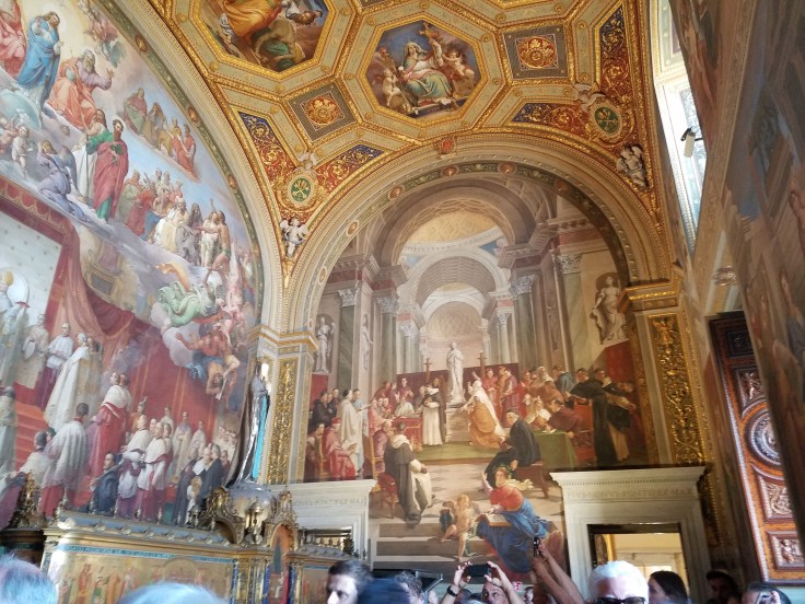 After a bit of a detour, we finally arrived at our planned drop off point and said goodbye to Sauro. I’m sure he was ready to get out of Rome and get home to Florence. Our group, baggage in hand, followed Sarah like ducklings following their mother down a busy street to our hotel. Sarah had warned us on our way to bring down our expectations, especially since we had just left an amazing agriturismo with beautiful views and fancy amenities. This hotel is much more simple but heck, it’s got beds and a bathroom. What more do you need!? We had time to get settled in and grab a quick lunch before meeting up in the lobby to head for the Vatican museums and Sistine Chapel. Lynne, Ed, Mom and I just stayed on our street and found a little spot with pizza by the slice and a variety of plates to choose from. I got a mushroom pizza and Mom went for a vegetarian lasagna. Pretty darn good for under €10!
