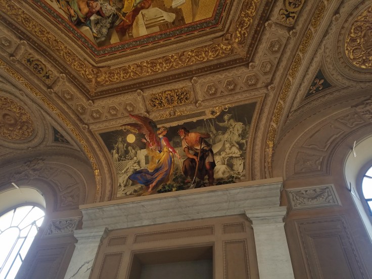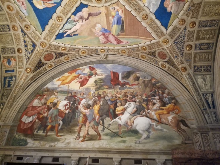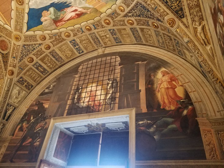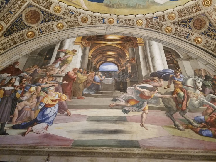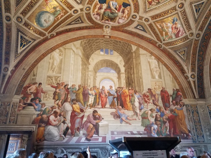 At some point, we popped into rooms painted by Raphael, an artist I only know because Mom has mentioned his name so often. I like that he often painted himself into his painting, looking out as if to see the viewers reactions. In this particular painting, he is on the far right with a black hat.
