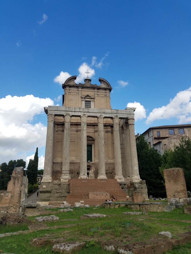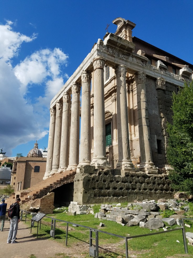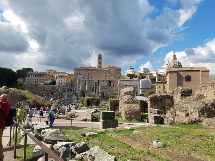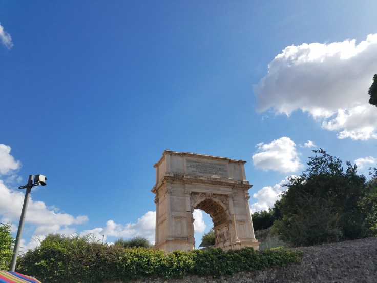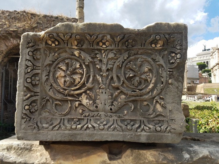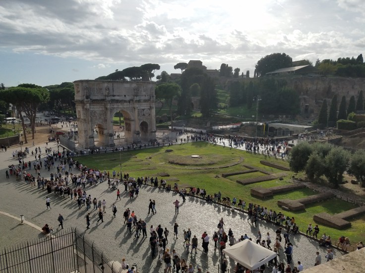 At 1 pm, we gathered up again and took the prearranged taxis to the Roman Forum/Colosseum. Our local guide, Maria Laura, joined us again and led us on another extremely informative tour. I wish we’d had a lot more time to wander/see more of the Roman ruins in that area but we had a schedule to stick to. This first triumphal arch was dedicated to Constantine but I found it interesting because it was actually made from pieces of other arches.