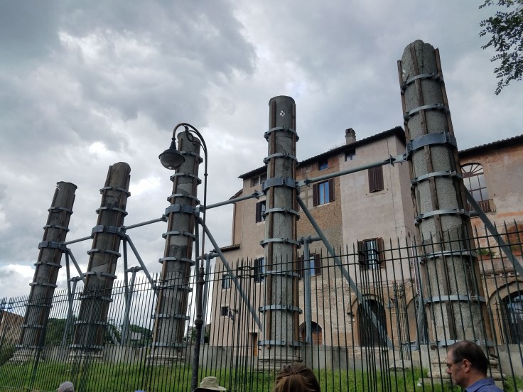 These columns must have been dangerously close to crumbling down before they put all these braces on them.