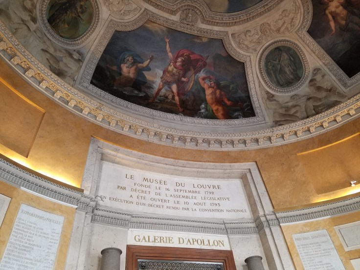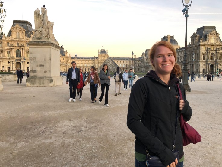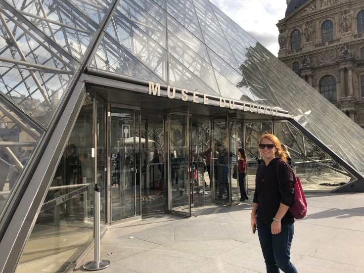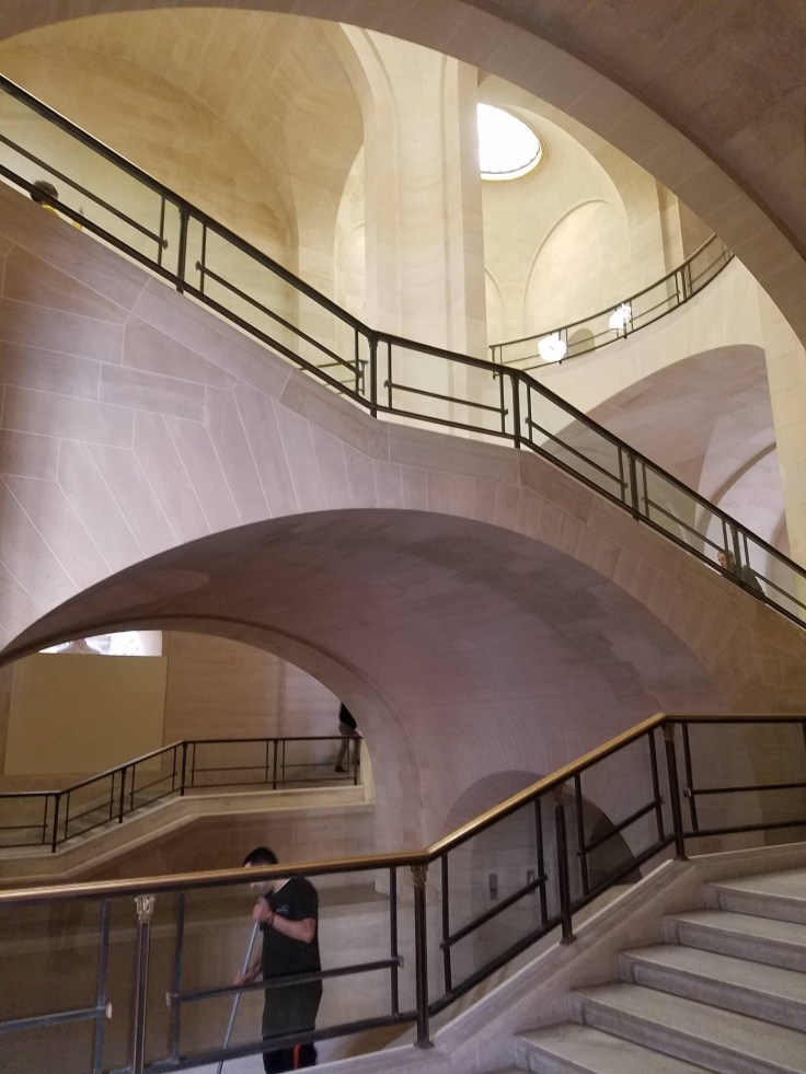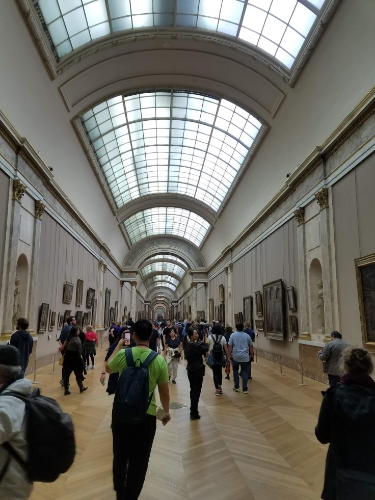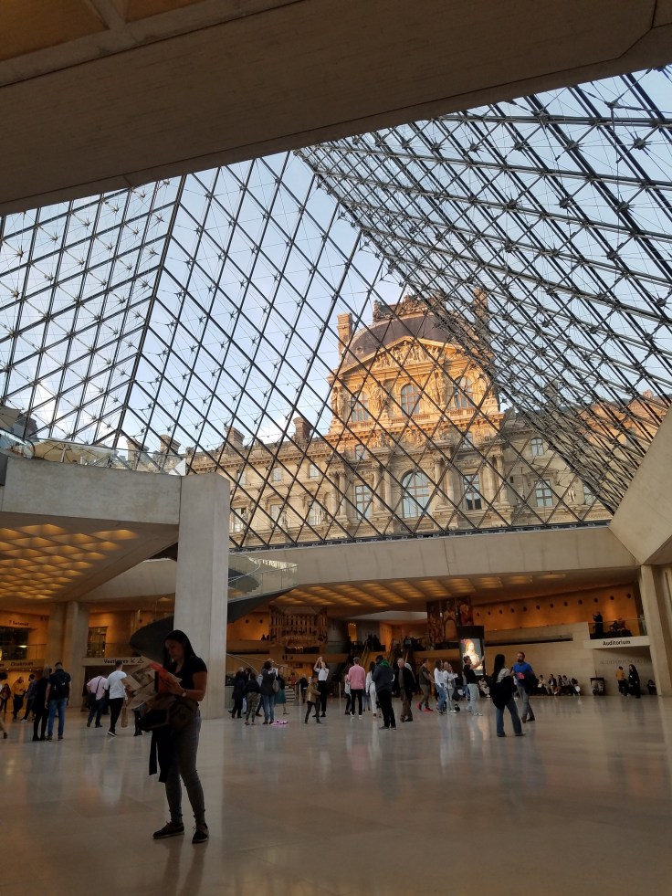 Once we hit the Place de la Concorde roundabout, we crossed the road (around all the confusing construction), and found an entrance to the Tuileries Gardens that led the rest of the way to the Louvre. It was a good thing we’d admired them a few times already because today we didn’t have time to dawdle. We got to the street level entrance of the Louvre a couple minutes after 4, cutting it close! Of course that’s only where you enter the pyramid. Then we had to take the stairs down and get in the actual entry line. I really hoped they weren’t super stringent on the time!