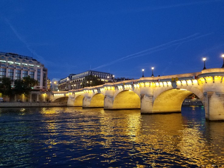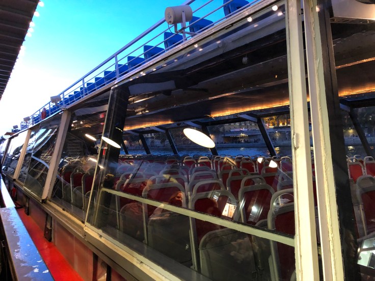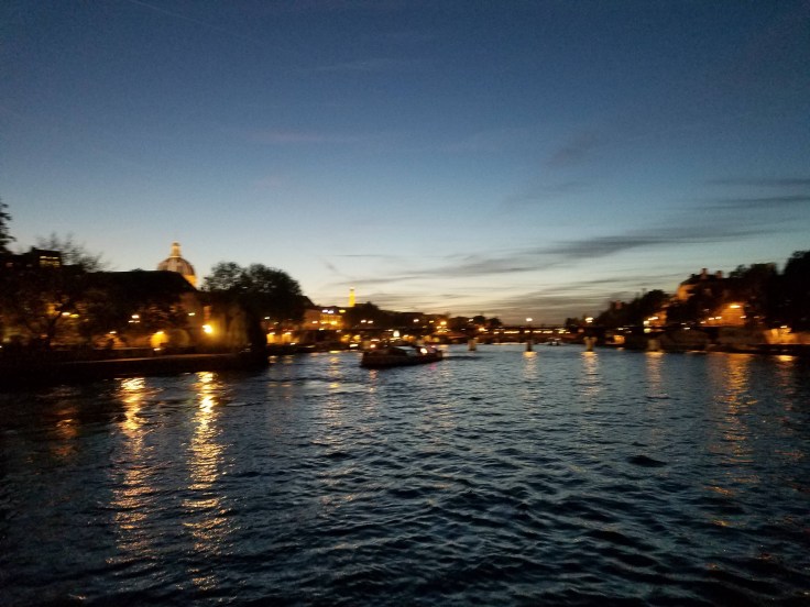 From the Louvre, all we had to do was go a couple blocks and then cross the Seine to get to the Vedettes du Pont Neuf docking point. I could see the boat from the bridge but it took a bit to find the tiny, dark, hidden stairway that led down to the riverside paths. The city lights were coming on and the sky was just starting to darken as we boarded the boat, exactly as I’d hoped. We were in the first handful of people to get on and everyone headed straight up to the top of the boat, though there was seating on the lower level too. It wouldn’t have been near as enjoyable if we’d had to sit down there. We’d gotten extremely lucky with the weather today too. It wasn’t t-shirt temperatures by any means, but I was comfortable in just my thin jacket on the boat.