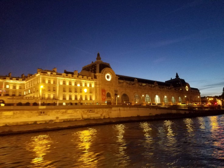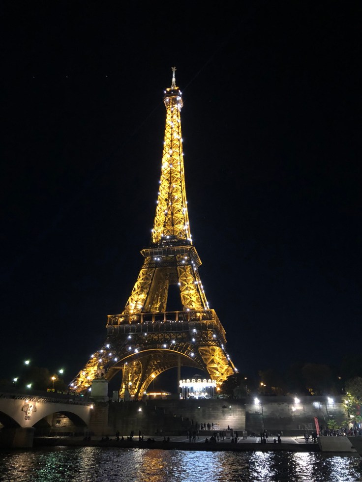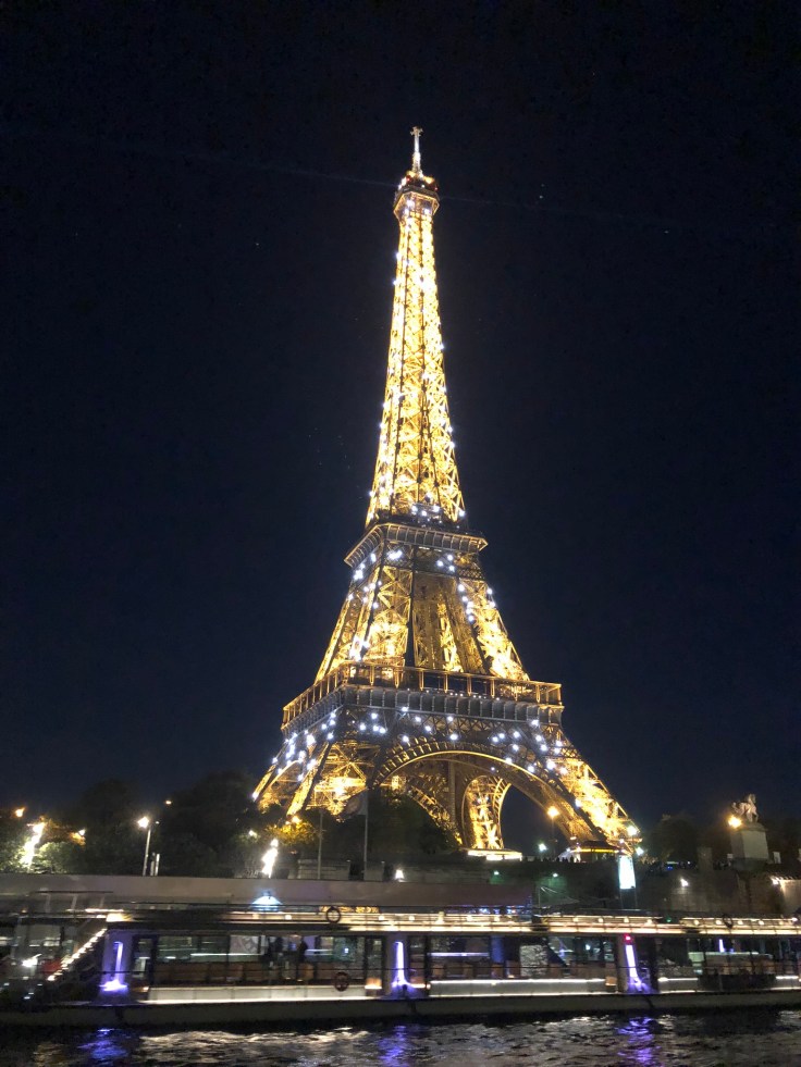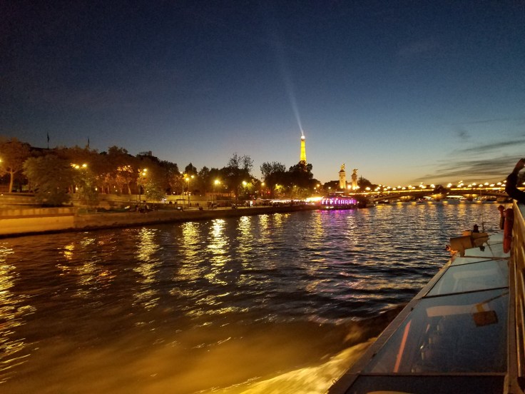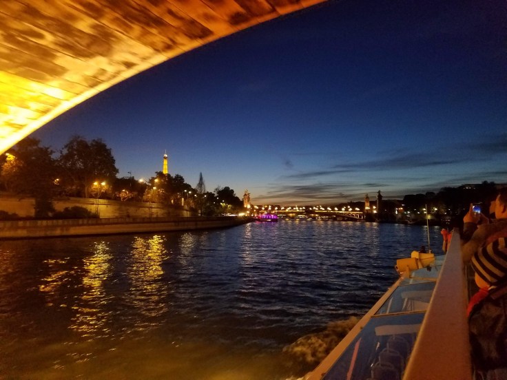 Everyone got boarded and we set off down the river towards the Eiffel Tower with our (quite handsome) guide pointing out the sights and explaining a bit of history along the way. My stomach was starting to growl, so I snacked on what we had left, carrots. Go figure, I’ve probably eaten thousands of carrots since I had braces and had permanent retainers put in my mouth, but I had to bite weird on THIS carrot in PARIS and bend my retainer wire! UGH. I suppose I’m really lucky I only bent it and didn’t break it. It’s putting pressure on my teeth and is definitely uncomfortable but not causing a huge deal of pain. Put a bit of a damper on this otherwise pretty great day.