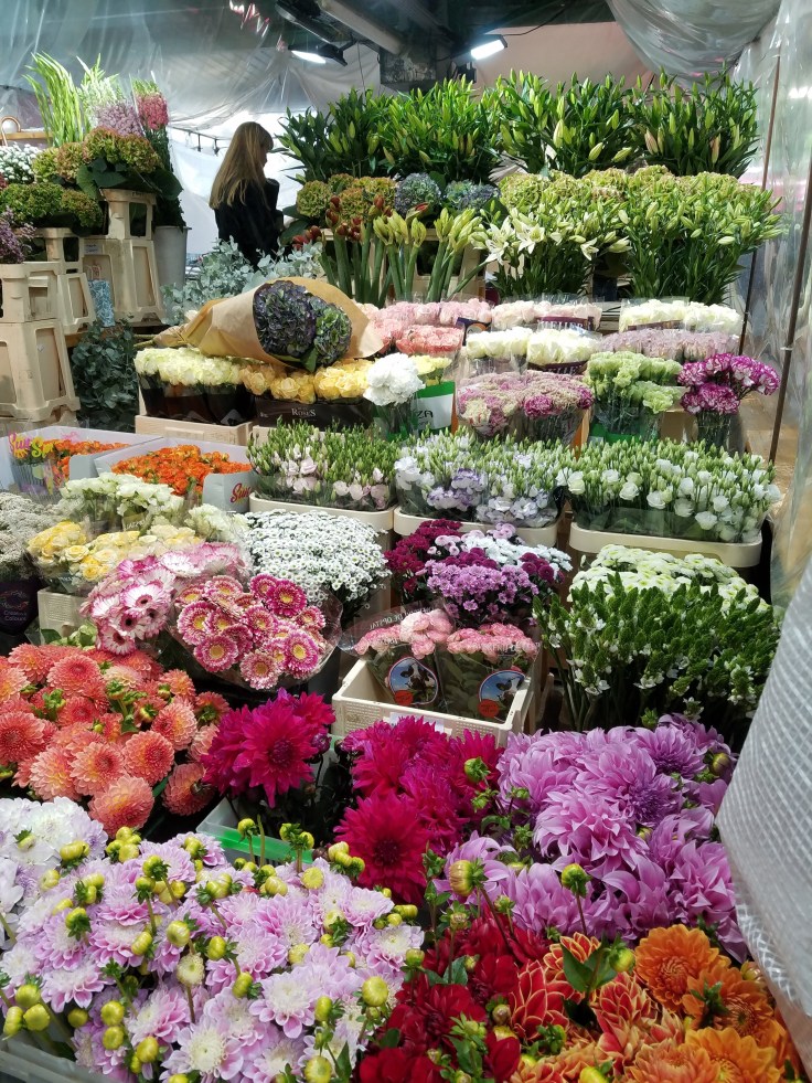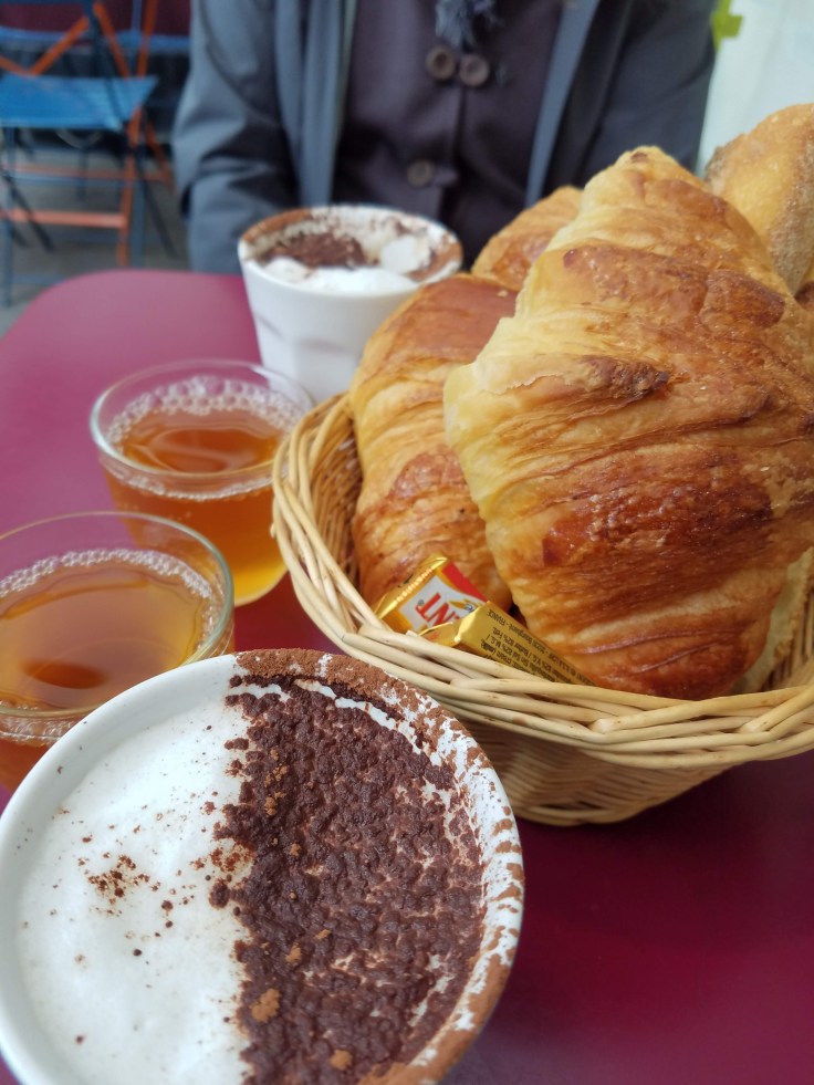 This morning we actually stayed in bed till after 8! India has been very helpful with making plans and pointed out a few different places to get some breakfast. We still didn’t have a concrete plan of what we were doing for the day so we did a lot more vacillating before finally deciding to just go find one of India’s suggestions, a little market called Les Enfants Rouge. Turns out it wasn’t too easy to find so we had to turn around and go back to the apartment to double check directions. Turned out we’d been just a few doors away… It was pretty quiet (and almost noon) when we finally found the little market and we were the only ones at the restaurant. We got a simple brunch, cappuccinos and croissants. Delicious. This market wasn’t near as pretty as the one in Annecy, but did have cheeses, vegetables, flowers… We ended up buying some snacks to get us through til dinner.
