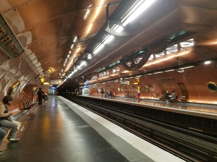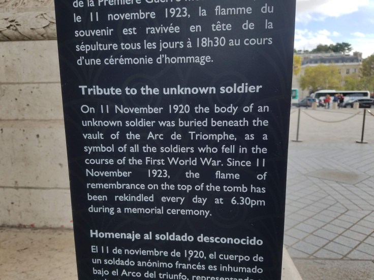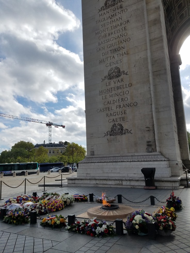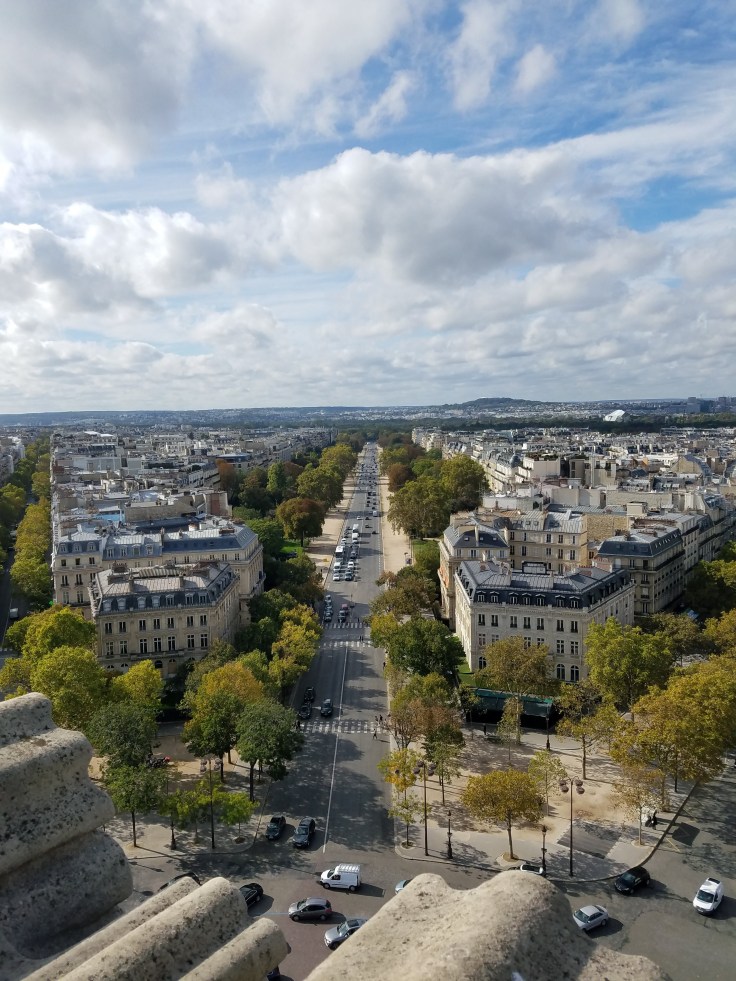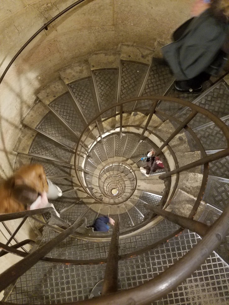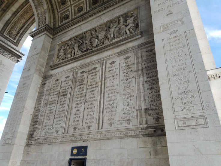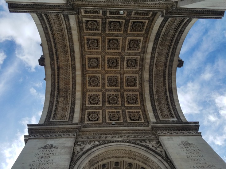 We took the metro to the Arc de Triomphe station – can’t miss it! – and followed signs to the Arc. Thankfully, someone was thinking ahead and created tunnel access to it under the road. It was also included in our museum pass but no skip-the-line benefits. I’d seen the Arc last time I was in Paris but we didn’t climb it. There was a bit of a line, but it moved along and eventually it was our turn to start climbing. A spiral staircase took us up inside the Arc, ending on a floor inside the Arc! Who knew?! There’s a souvenir store and bathrooms way up there! From that interior floor, another couple flights of stairs took us the rest of the way up to the top of the Arc. The views were well worth it. From there we could see the high points of Paris, the Eiffel Tower and Sacre Coeur, and tried to orient ourselves to where ish our ‘home’ was. After a couple circuits of the roof, we made our way back down through the Arc.